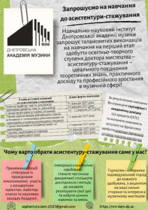 - Запрошуємо на навчання до асистентури-стажування Дніпровської академії музики!Більше деталей щодо навчання, вступу, перелік необхідних документів та програми вступних випробувань Ви знайдете на офіційному сайті навчально-наукового інституту у розділі “Аспірантура та асистентура-стажування”. Лишилися питання? Звертайтеся на електронну адресу: aspirantura.dam.2021@gmail.com