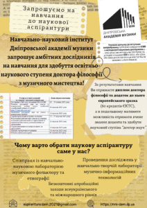 - Запрошуємо на навчання до наукової аспірантури Дніпровської академії музики!Більше деталей щодо навчання, вступу, перелік необхідних документів та програми вступних випробувань Ви знайдете на офіційному сайті навчально-наукового інституту у розділі “Аспірантура та асистентура-стажування”. Лишилися питання? Звертайтеся на електронну адресу: aspirantura.dam.2021@gmail.com