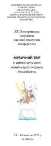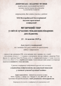 - Незабаром відбудеться ХХІ Всеукраїнська дворівнева науково-практична конференція “Музичний твір у світлі сучасних міждисциплінарних досліджень”Запрошуємо доєднатися до ХХІ Всеукраїнської дворівневої науково-практичної конференції “Музичний твір у світлі сучасних міждисциплінарних досліджень”, що відбудеться 13-14 жовтня 2025 року у змішаному форматі на базі Дніпровської академії музики. Покликання на 13 жовтня 2025 р. (початок о 10:00)Ідентифікатор конференції: 831 3335 7182Код доступу: 440424 Покликання на 14 жовтня 2025 р. (початок о 10:00)Ідентифікатор конференції: 825… Read more: <b>Незабаром відбудеться ХХІ Всеукраїнська дворівнева науково-практична конференція “Музичний твір у світлі сучасних міждисциплінарних досліджень”</b>