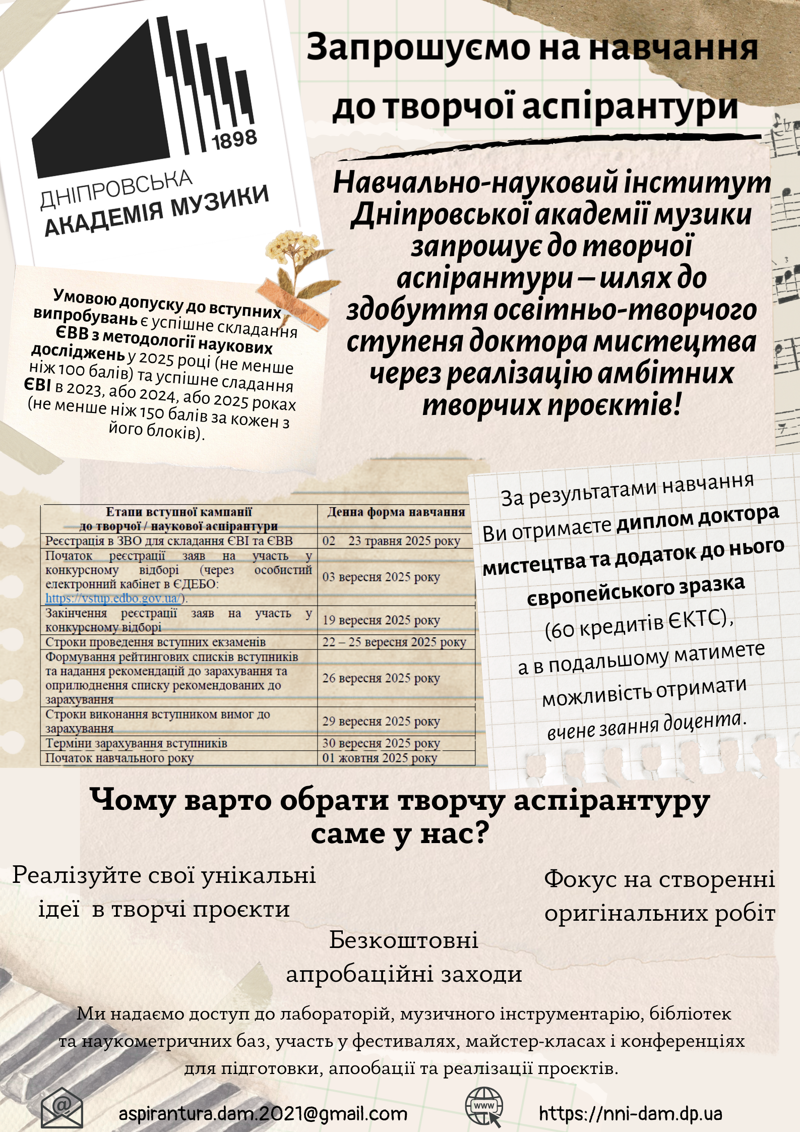 Запрошуємо на навчання до творчої аспірантури Дніпровської академії музики!