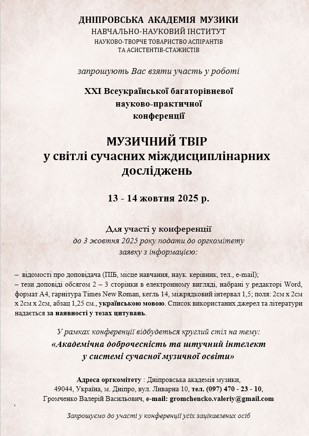 Запрошуємо взяти участь у ХХІ Всеукраїнській багаторівневій науково-практичній конференції “Музичний твір у світлі сучасних міждисциплінарних досліджень”, що відбудеться на базі Дніпровської академії музики 13 – 14 жовтня 2025 р.
