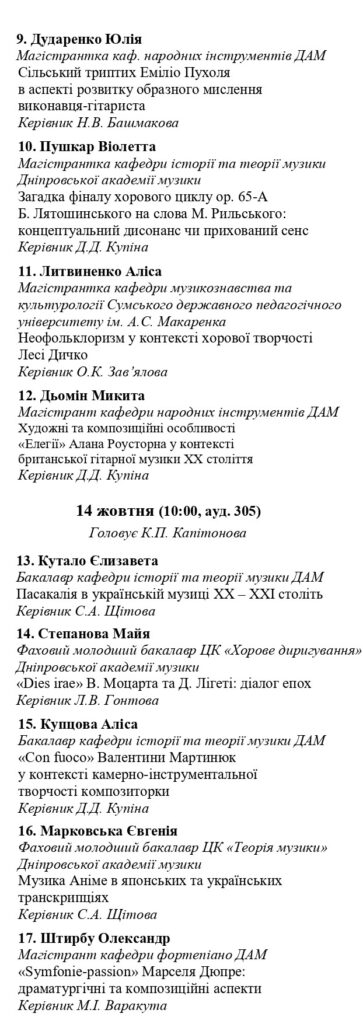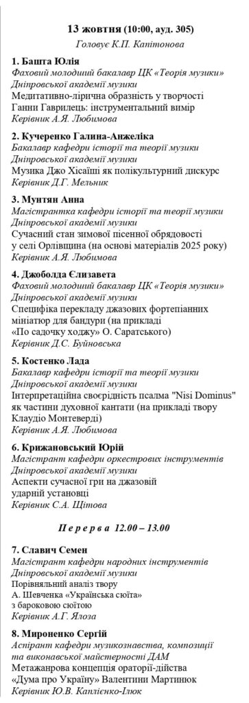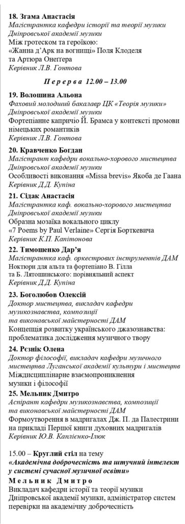 Наприкінці другого дня – 14 жовтня о 15:00 – відбудеться круглий стіл на тему: «Академічна доброчесність та штучний інтелект у системі сучасної музичної освіти», лектором виступить викладач кафедри історії та теорії музики Дніпровської академії музики, адміністратор систем перевірки на академічну доброчесність Дмитро МЕЛЬНИК.