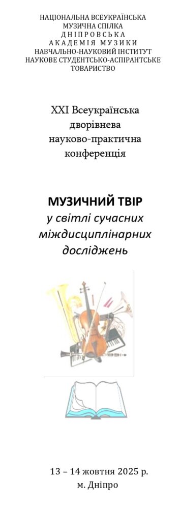 Запрошуємо доєднатися до ХХІ Всеукраїнської дворівневої науково-практичної конференції “Музичний твір у світлі сучасних міждисциплінарних досліджень”, що відбудеться 13-14 жовтня 2025 року у змішаному форматі на базі Дніпровської академії музики.